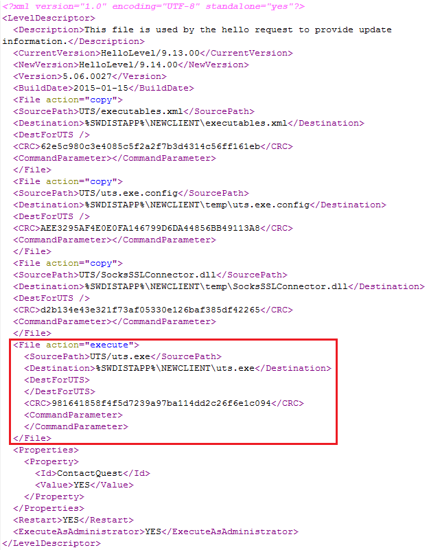 During the update process, an index file with a list of update operations is first downloaded via a connection secured using TLS. One update operation observed in this process is the downloading and launching of an executable file (uts.exe):