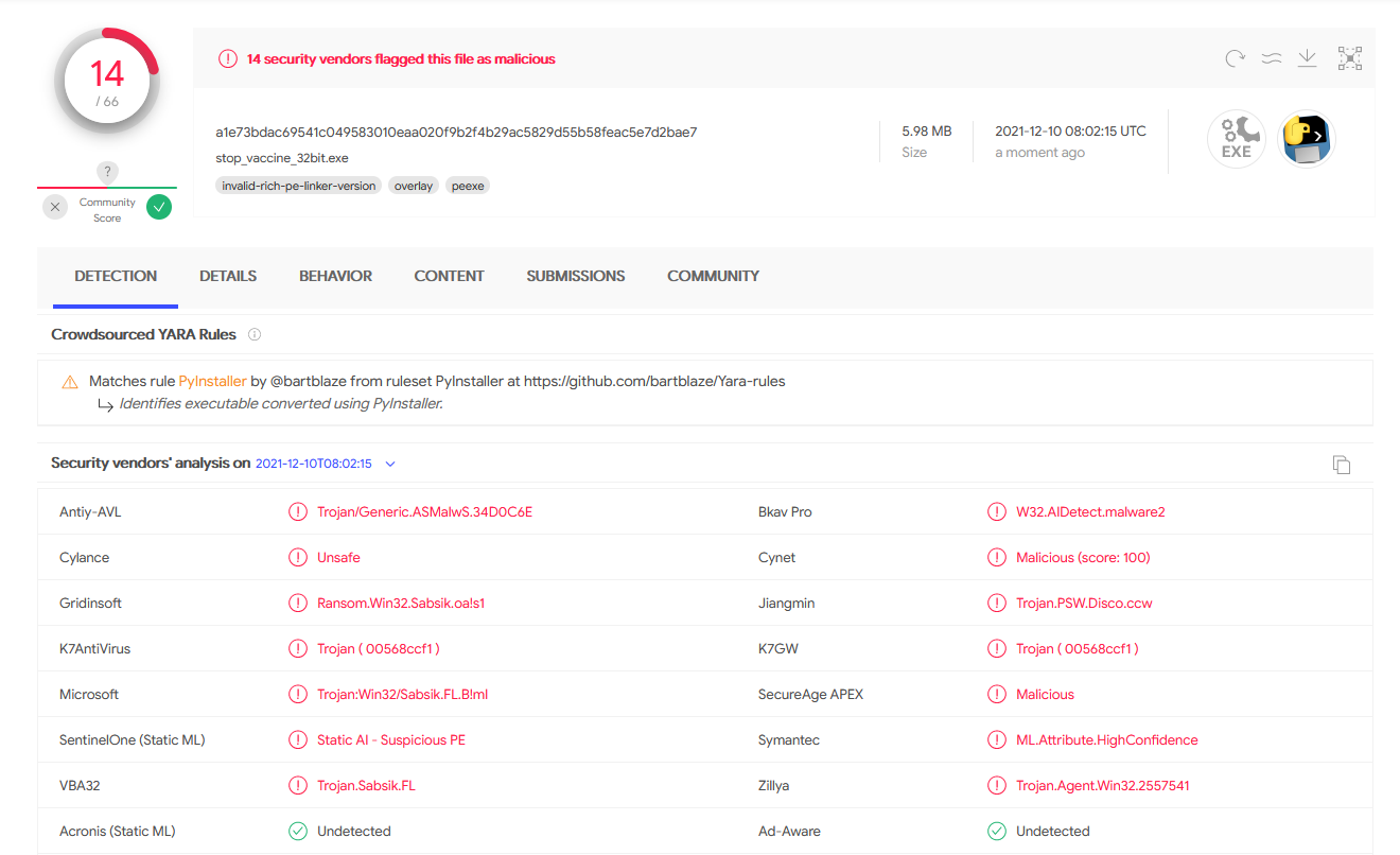 STOP/DJVU ransomware vaccine was created by John Parol and me. We published a tool on Github so that everyone can inspect and use it. Soon after publishing it, the tool got many false positive detections by antivirus vendors.