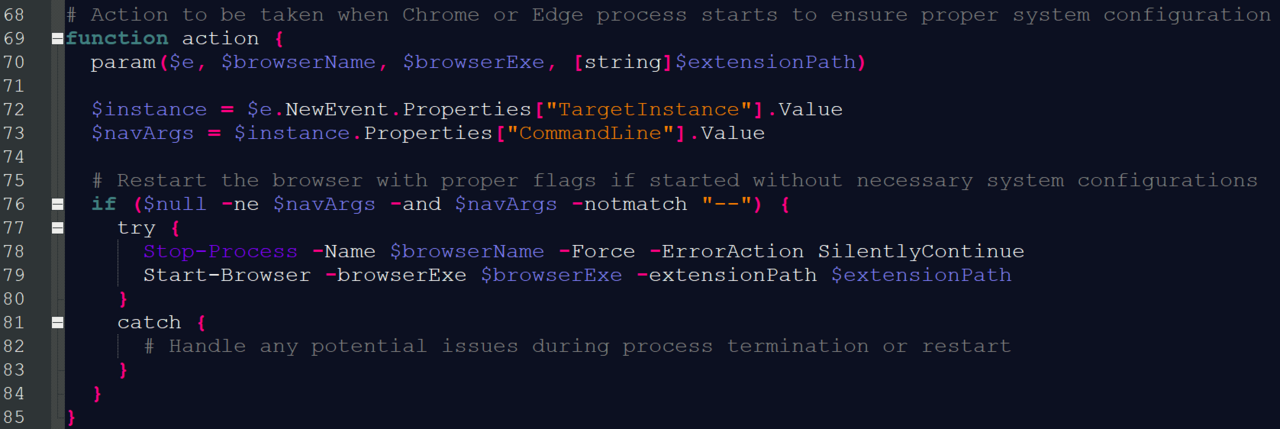One of the PowerShell scripts, named configuration.ps1[5], monitors WMI events to listen for chrome.exe and edge.exe process starts.