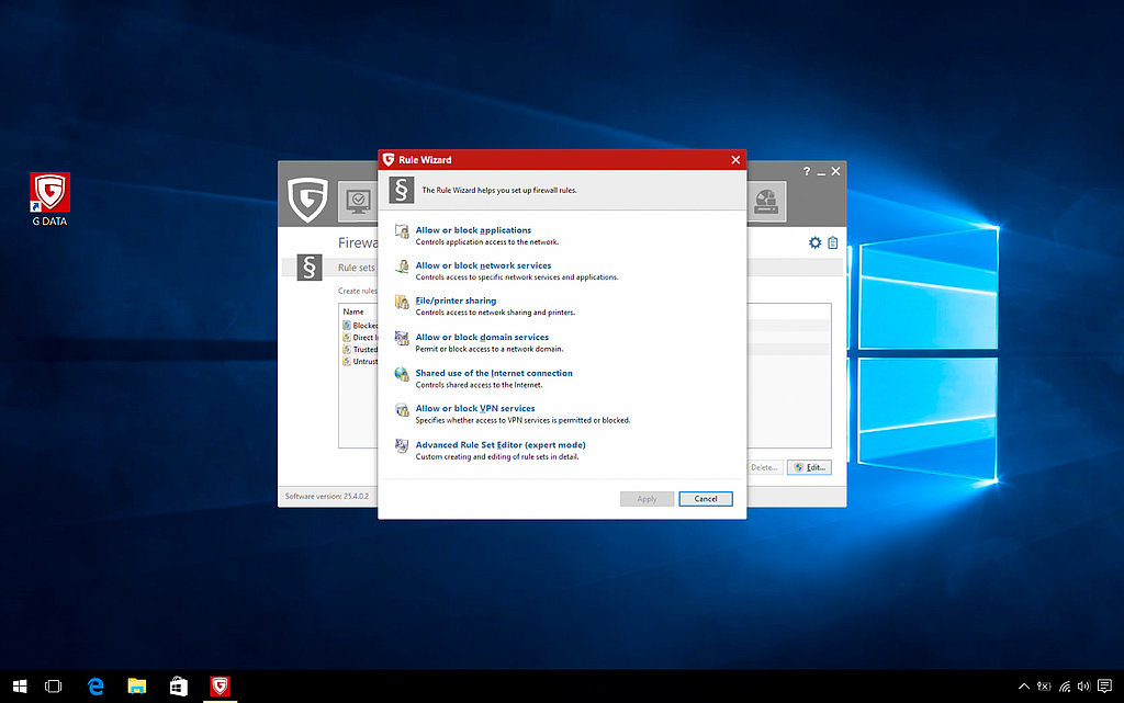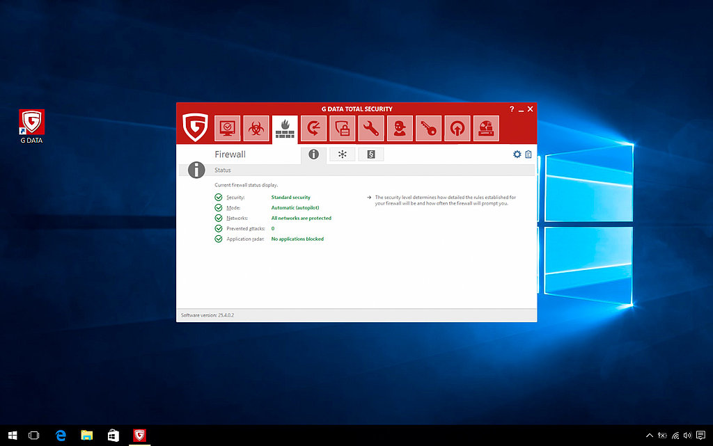 When you click on the "firewall" symbol at the top of the G DATA control panel, you can see your firewall's current configuration. For instance, you get a quick overview of which security level and which mode the firewall is set to.