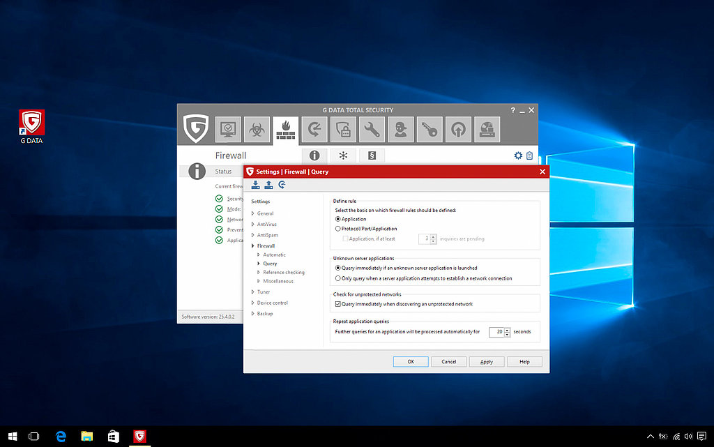 The firewall in G DATA security solutions reports a scan when somebody tries to scan your PC for open ports. Such queries can also be an indicator for an attack. A firewall can effectively stop this and prevent hackers from accessing your PC and / or turning it into a zombie PC or adding it to a botnet.