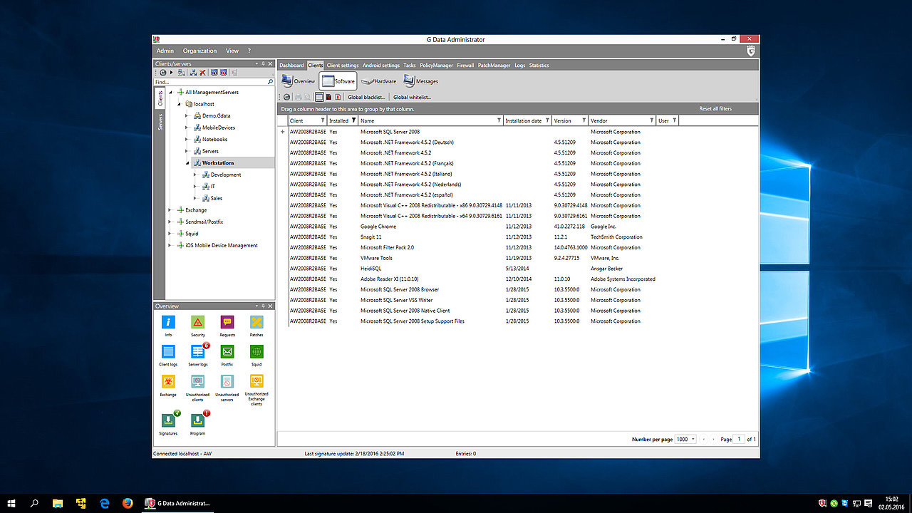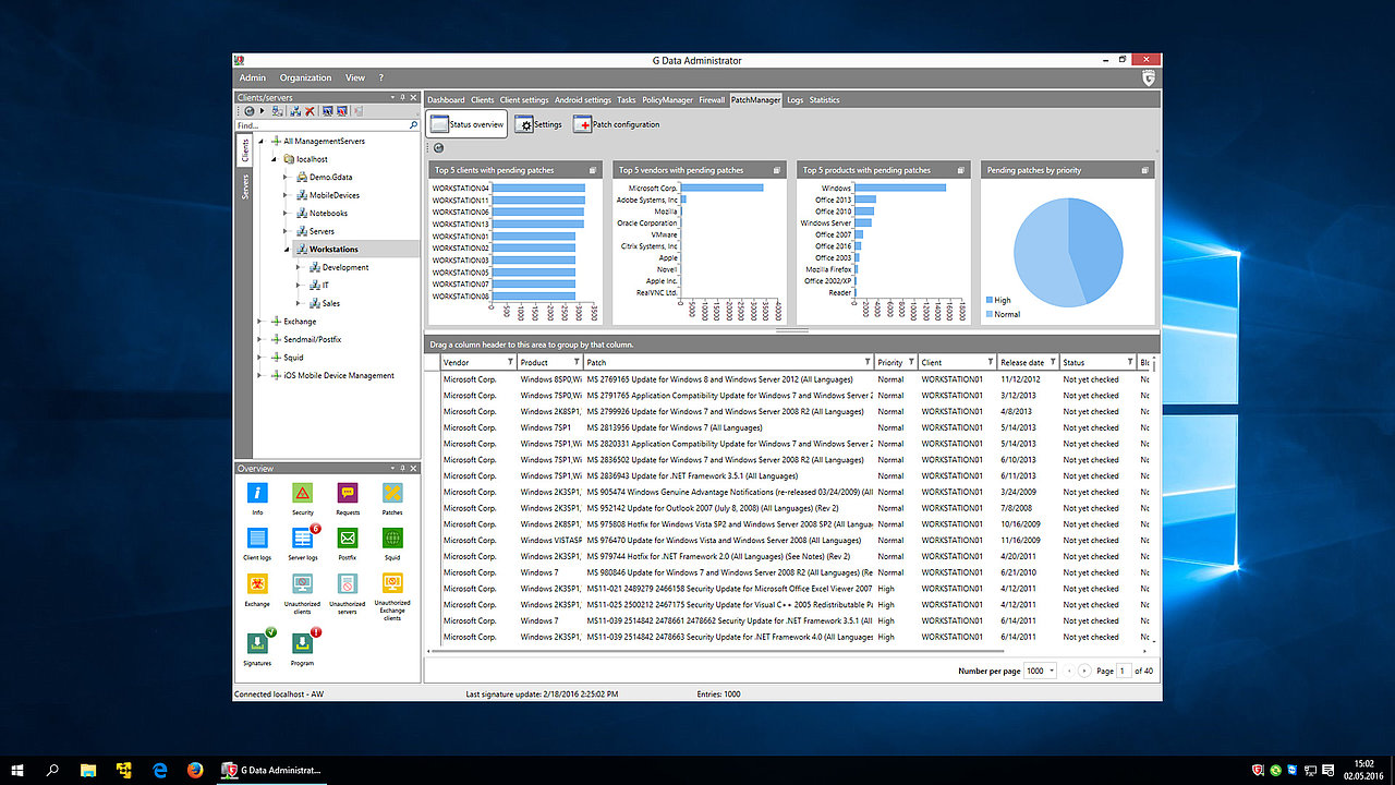 Easily managed functions help the network administrator to stay on top of things. The Patch Manager module provides important information to help plan the entire patch management process: Which program versions are in use on the network? Do the client computers or groups support the latest patches? You can select clients and collectively update their programs. Patch Manager can be implemented without reinstalling your G DATA business solution. In perfect cooperation with existing functions, Patch Management rounds off the protection of your company’s network.